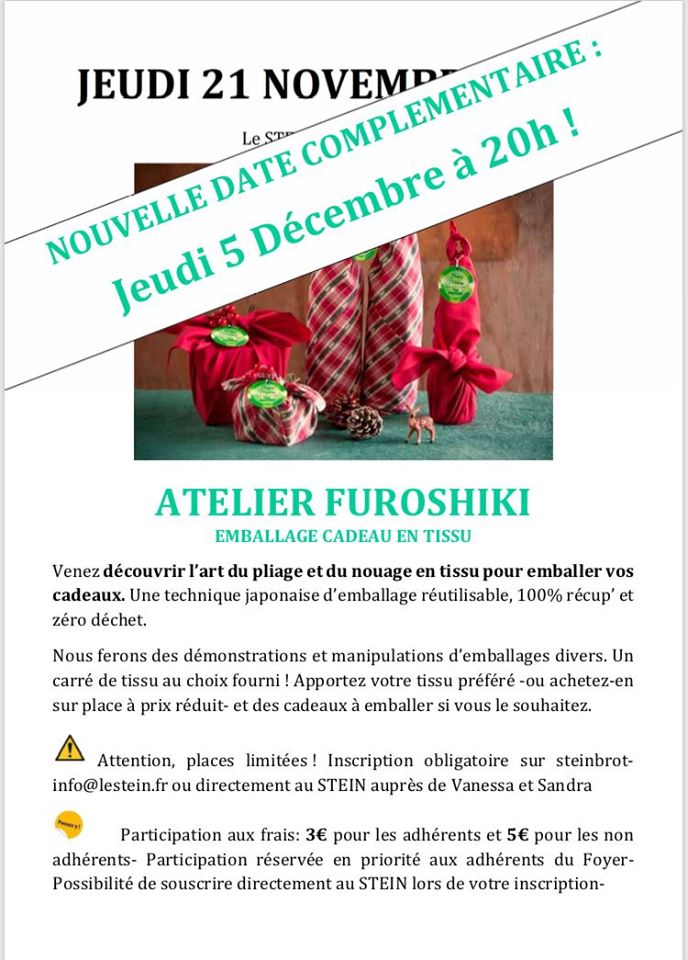 On vous attend le jeudi 5 décembre à 20h au STEIN avec vos tissus préférés si vous le souhaitez, des cadeaux à emballer ou juste votre bonne humeur! Nous ferons des démonstrations et manipulations d’emballages pour que vous soyez au top le jour J! Large choix de coupons en vente à prix mini sur place😉