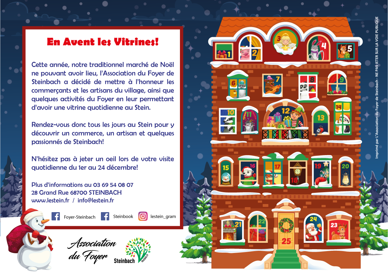 A défaut de pouvoir vous proposer notre marché de Noël, les commerçants et artisans du STEIN vont vous présenter leur calendrier de l’Avent en vitrine!! Découvrez tous les jours leur talent à travers une vitrine personnalisée…
