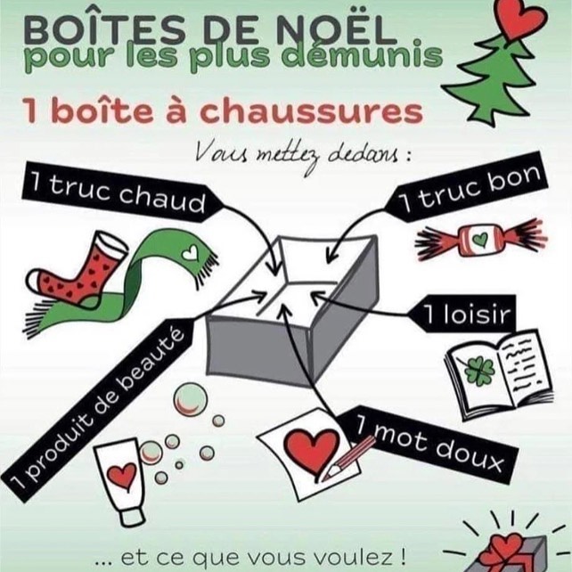 Des boîtes à chaussures garnies chacune de 5 petits cadeaux: du bon, du chaud, du propre, du réconfortant et du divertissant!
