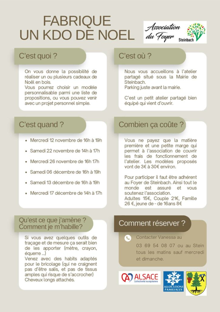 – Ouverture de l’atelier le 29 octobre à 18h30 (on vous attend! – le local est situé sous la Mairie de Steinbach), pour vous présenter les lieux, vous expliquer le fonctionnement et répondre à toutes vos questions!