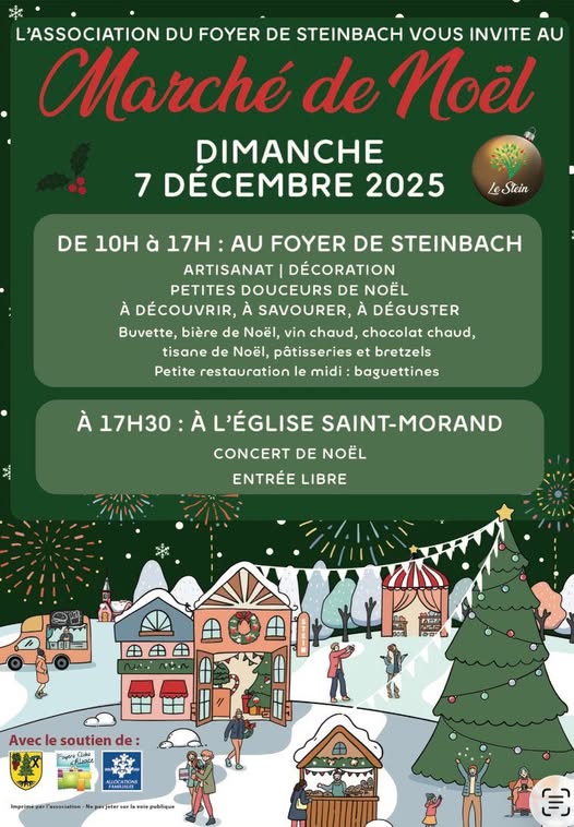 Venez faire un tour au marché de Noël de STEINBACH et découvrir le talent de nos villageois! Du local, du fait main, de quoi grignoter, réjouir vos enfants et vous réchauffer! Les sourires en plus ![]()