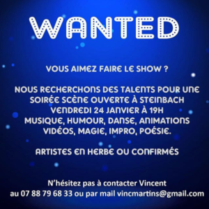 ➡️RDV VENDREDI 24 JANVIER à 19h pour la soirée scène ouverte de Steinbach⬅️.🎙🎭🎷C’est l’occasion de vous mettre en scène et de montrer vos talents cachés (ou pas)!! 💃🏻🤹🏼♂️🤸♂️.⚠️ N’hésitez pas